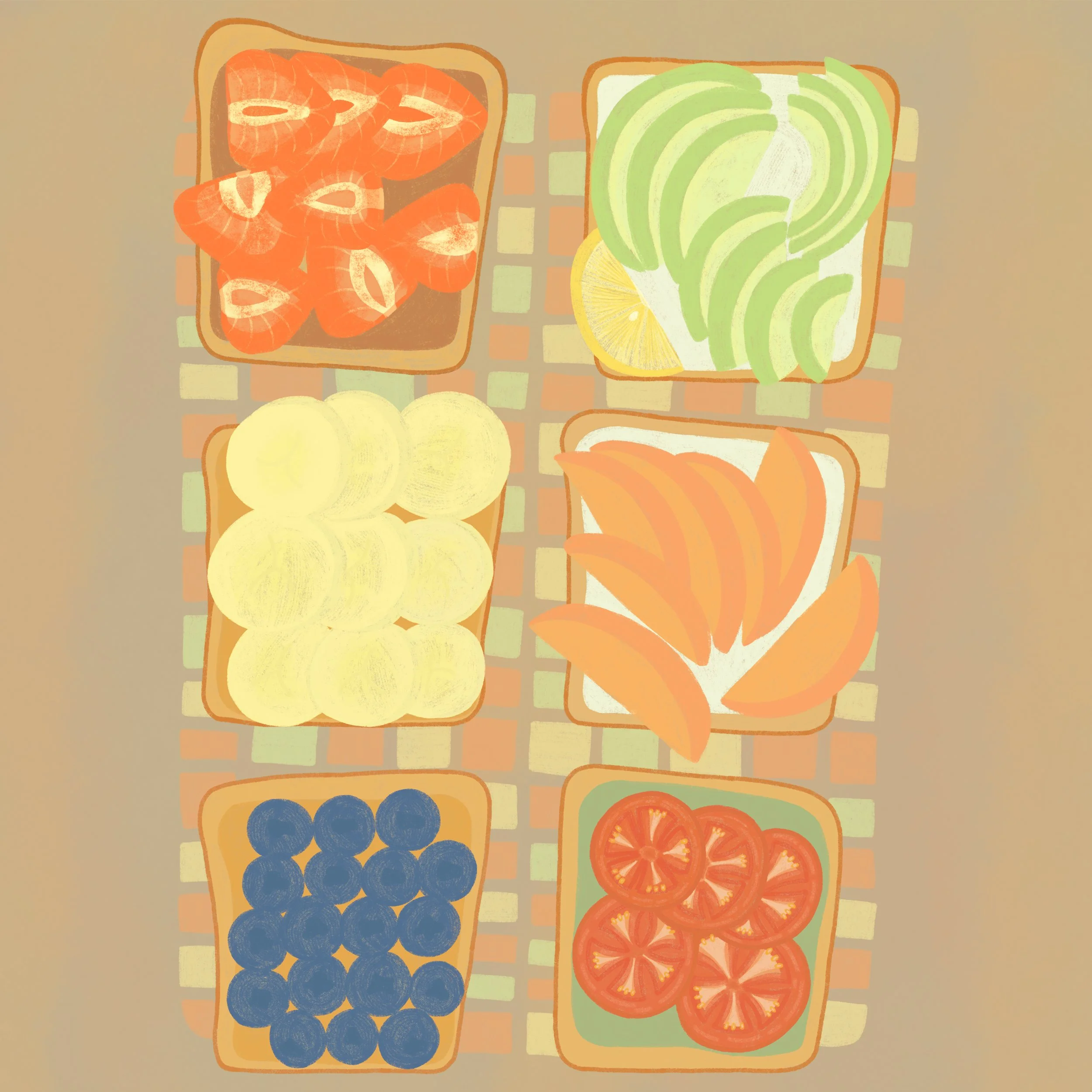 An illustration of six toasts, my latest artwork. It is quite minimalistic, has nice vintage optic and drawn in warm, mild colors. I hope I created a good print for the kitchen and dining area.